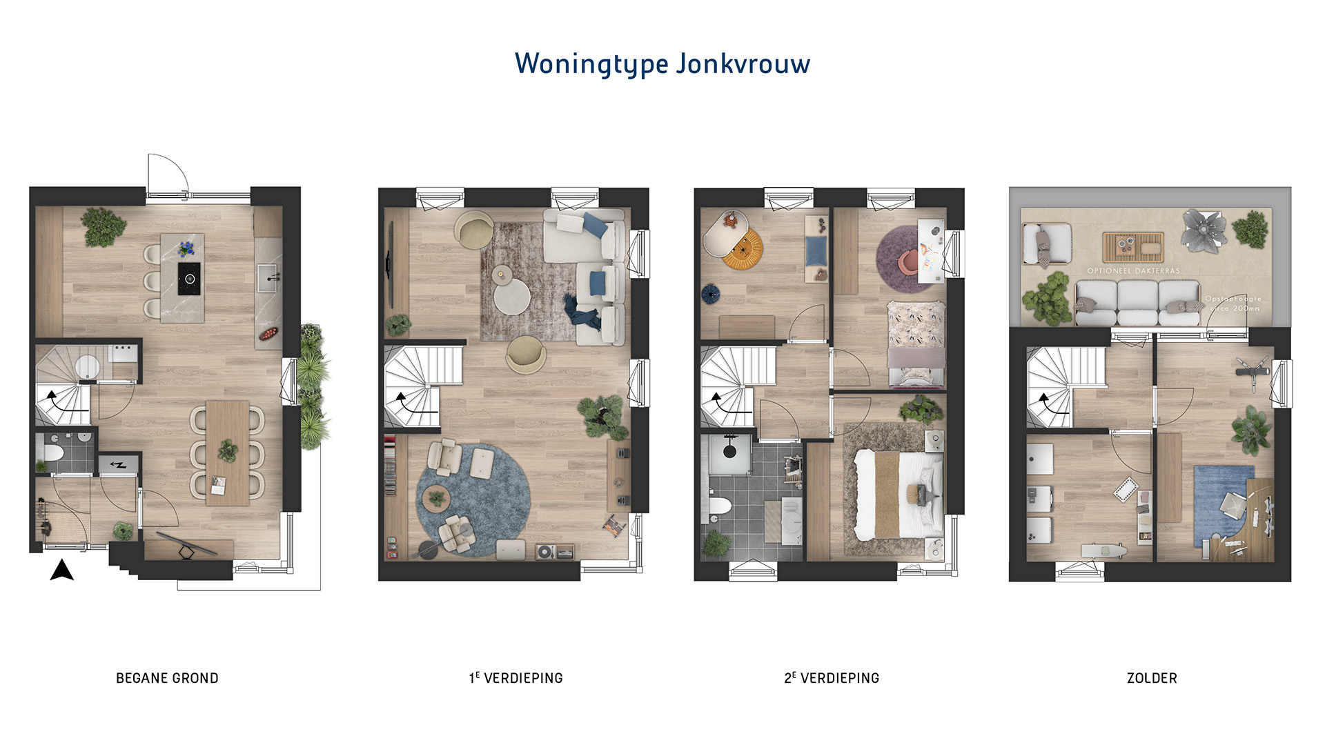 De woning beschikt over drie royale slaapkamers. Op zolder is er nog een onbenoemde ruimte die gebruikt kan worden als werkplek, hobbyruimte of als extra bergruimte. Extra fijn is de mogelijkheid voor een dakterras: een heerlijke plek om even naar buiten te gaan, van de zon te genieten of de dag rustig te beginnen of af te sluiten. Ook praktisch is alles goed geregeld, met twee parkeerplaatsen op eigen terrein en een berging met mos sedumdak voor fietsen en opslag. De gevel wordt verrijkt met een groen begroeiingspatroon van klimplanten, wat bijdraagt aan de uitstraling van de woning. Met diverse kopersopties, zoals een uitbouw van 1,2 of 2,4 meter en de keuze voor openslaande deuren of een schuifpui, maak je van woningtype Jonkvrouw een echt uniek thuis dat helemaal past bij jouw woonwensen.
